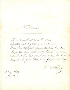 ornements dorés.{CR}Album de Gabrielle Nicod de Ronchaud, née Benoit de Saint-Vandelin, mère de l’historien Louis de Ronchaud (1816-1887).{CR}Marquis de Foudras (poème Frontispice, 3 mai 1839), baron d’Eckstein (Pise 7 novembre 1839, « Avoir de l’esprit, Madame ? »…), Alphonse de Lamartine (« Vous êtes le fleuve qui entre dans l’océan »…, non signé), Louis de Ronchaud (poème A ma mère, janvier 1854), Charles Brifaut (poème « Quand je sens d’un air pu la fraîcheur passagère »…), Guillaume Hyde de Neuville (avec poème Fragmens sur l’exil, Paris 23 mars 1840), Xavier Marmier (poème Sur mer), Charles Viancin (poème, L’insomnie d’un avare, Fable), Auguste Dusillet (poème « Veux-tu connaitre l’avenir »…, Avril 1851), Charles Weiss (quatrain Déclaration tardive, mai 1851).