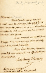 Jules BARBEY D’AUREVILLY. L.A.S., [à Joseph Depoisier] ; 1 page in-8.{CR}Il lui adresse la lettre qu’il lui avait promise pour M. Alloury des Débats. « Je ne vous ai pas oublié, vous le voyez. Il ne faut pas que vous pensiez mal de la...