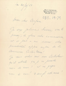 Louis-Ferdinand CÉLINE (1894-1961). L.A.S. « Destouches », Meudon 20 novembre 1954, au Dr Blouët à Troyes ; 2 pages et demie in-4 avec son cachet encre en tête, enveloppe.{CR}Il le remercie de son « appui providentiel auprès de la...