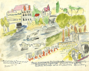 Lhoste : Jour de fête (gouache, 33 x 25 cm), paysage « mon premier pastel » (22 x 27 cm), maison dans les arbres (pastel 27 x 22 cm), vue de Moret-sur-Loing « ma première aquarelle » (23 x 28 cm).{CR}On joint une L.A.S. à Pierre Lhoste (1959).
