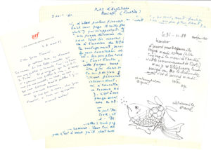 Boutelleau, José Cabanis, Jacques Chardonne (à B. Frank), René-Jean Clot (6, avec petits dessins), André Dhôtel, Pierre Fauchery (5), Matthieu Galey (3, dont une signée « Conrad Jansen »), Marie-Louise Hart de Keating (3, au sujet de Germain Nouveau), Yves-Gérard Le Dantec, Milorad (3), Maurice Nadeau (2, plus le Manifeste des 121 sur la guerre d’Algérie), François Nourissier, Jean-Louis Ozanne (2, sur la revue Seine, 1946), Maria Péron, Léon Pierre-Quint, Nathalie Reznikoff (au sujet de Remizov), Jean-Pierre Selz, Lily Siou, Antoine Tavera (3), Franz Thomassin (2, dont une longue lettre sur l’érotisme), Henri Wetzel… Plus des dédicaces de Daniel Boulanger (2) et Alain Bosquet.{CR}Manuscrits : Jean Abraham, Maurice Fickelson, Bernard Frank (fragments), Éric Jourdan (2), André Julien.{CR}On joint divers documents concernant Jacques Brenner ; un scénario ronéoté de Jacques Prévert, Hécatombe ; un fac-similé de Baudelaire ; un dessin à la plume signé « Philippe Jullian p.c.c. Conrad Jansen ».