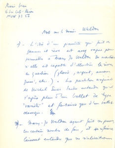 Boris VIAN (1920-1959). Manuscrit autographe signé, Note sur le dossier Weldon ; 2 pages in-4.{CR}Note sur la chorégraphe Mary-Jo Weldon, qui doit monter un ballet sur une musique de Michel Emer : « 1) L’idée d’un pianiste qui fait ses...