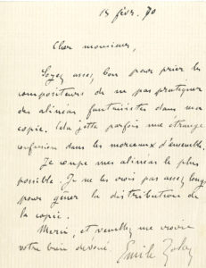 Émile ZOLA (1840-1902). L.A.S., 15 février 1870, [au directeur de la Librairie Nouvelle ?] ; 1 page petit in-8.{CR}« Soyez assez bon pour prier les compositeurs de ne pas pratiquer des alinéas fantaisistes dans ma copie. Cela jette parfois...