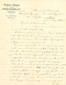 HORLOGERIE. PATEK, PHILIPPE. L.S. « Patek, Philippe Co », Genève 18 juillet 1882, à Fernand Lajarrigue, consul du Portugal à Nice ; 2 pages et demie in-4 à en-tête Manufacture d’Horlogerie. Patek, Philippe & C°.{CR}On l’informe...