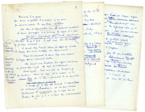 dû servir à préparer un séminaire ; de tout premier jet, d’une écriture cursive et rapide, parfois difficile à déchiffrer, il présente de nombreuses ratures et corrections, certaines au stylo à bille rouge, et des ajouts dans les marges.{CR}Lacan suit le cheminement de sa pensée et enchaîne des réflexions d’une thématique à l’autre. Il part du « sujet » qu’il place dans diverses situations : appartenance à la communauté, identité, liberté, culpabilité, morale, rôle de la société et du langage, travail etc.{CR}« Assomption de soi-même qui renvoie le patient de la maladie à son sens. Que représente la maladie dans sa forme constituée. De là dans sa signification pour un sentiment immédiat. Ses besoins par rapport à un entourage sur lequel il a prise familial, professionnel voire social […] Le sujet parle selon un langage en principe universel ».{CR}L’appartenance à une communauté oblige à une discipline des rapports et des fonctions : « donner son style et sa valeur, à la face que les êtres présentent les uns aux autres. L’image que les êtres donnent d’eux-mêmes est évidemment (formatrice) et l’on peut constater couramment l’interrogation qu’il reçoit dans les fonctions du rôle qu’il a à jouer dans la communauté ». Le sujet doit se soumettre à une « règle psychologisante, l’association libre par exemple. Mais nous avons montré qu’il n’y a pas d’association libre, pas plus qu’il n’y a de crime naturel. […] La culpabilité a sans aucun doute une beaucoup plus haute importance dans la psychanalyse d’un “primitif” chez qui la société est reçue pour être en harmonie avec le Cosmos où les rites de la fécondité seuls sont parallèles à ceux qui auront l’ordonnance de la nature. La conscience malheureuse de l’homme qui se connait comme détaché de l’ordre primitif instauré par Dieu […]. La révolte moderne est le reflet de cette conscience malheureuse qui rend le sentiment moindre en même temps qu’elle l’exclut de la perfection ».{CR}Lacan insiste sur le rôle du modèle, « de l’exemple vivant ou imaginaire. Ce qui est fourni à l’âme d’un jeune français cultivé par Lucien Leuwen, n’est pas plus significatif que celui des biographies de vedettes pour la sténodactylo. Je répugne à infléchir ce discours par la supériorité impliquée dans l’emploi du terme de midinette, sinon pour faire réfléchir que ce qui donne sa valeur propre à ce terme c’est justement l’idée d’un être possédé au-delà de tous ses moyens par des idéaux. Que la qualité de ceux-ci soit celle des objets de bazar, soit on en impute la faute à l’individu qui s’en contente plutôt qu’à la communauté qui le lui permet ».{CR}Le sujet qui s’exprime par “Je” « reconnait à ce Je un caractère objectivable, où il le voit comme « moi » comme « entité au minimum liée aux limites et aux servitudes de son corps » ; et plus loin : « En fait le moi est bien une synthèse à tout instant recréé dans notre vécu. Mais que nous aurions tort d’identifier aux formes supérieures de l’activité personnelle traditionnellement reconnue par les antiques formes du vouloir et du connaître »…Lacan en vient alors à la morale : « On ne saurait bénéficier que par le plus noir artifice de qualificatifs de morale provisoire pour la raison qu’il est clair qu’il s’agit de la morale tout court » ; et il conclut « Le moi ne peut être tenu pour indépendant de certaines structures sociales ». Lacan fait un graphique comparant Dialectique, Psychologie et Anthropologie, et enchaîne : « Le “moi” est une synthèse assurément dans l’analyse mais une synthèse négative et aliénante. Il ignore ce qu’on appelle la pulsion. Il la méconnaît. Méconnaissance systématique. Il se construit dans la négation de la réalité et l’inversion des pulsions. Il est dans une parenté évidente avec le délire. Il est d’autre part corrélatif de la structure du monde humain en tant qu’il dépend de l’objet. Comme entité – constance – permanence – substance. Comme plurivalence – instrumentale – symbolique. Une branche est virtuellement bâton ou bûche »… Etc.{CR}La suite du manuscrit est moins formulée. Ce sont plutôt des notes jetées sur le papier. Il insiste sur l’importance de la psychanalyse qui est une technique, mais « ce n’est pas une science. Clef de toute approche scientifique de l’homme »… Il insiste aussi sur le rôle de la parole… Etc.