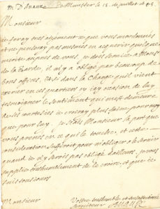 (brisés).{CR}Lettre écrite du congrès de Munster lors de la négociation du traité de Westphalie.{CR}« Je feray tres aizément ce que vous mordonnés et ne penseray pas mesmes en acquerir quelque merite aupres de vous. Je dois service a Monsr de La Barde, il m’y a obligé par beaucoup de bons offices, et si dans la charge quil vient exercer en ces quartiers cy jay occasion de luy tesmoigner le sentiment qui mest demeuré de ses courtesies je croiray plus faire pour moy que pour luy »...
