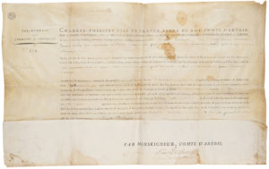 CHARLES X (1757-1836). P.S. « Charles Philippe » comme comte d’Artois, duc et comte d’Auvergne, Versailles 17 janvier 1775 ; contresignée par Poret de Blosseville ; vélin in-plano en partie impr. (qqs taches).{CR}Lettres de foi, hommage...