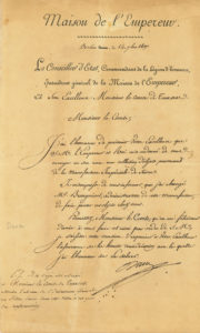 envoyer en son nom une collection d’objets provenant de la Manufacture Impériale de Sèvres »… Paris 11 janvier 1809, à M. Noël, notaire de Sa Majesté, sur le paiement du solde dû par Napoléon pour l’acquisition du château de Saint-Léger… 19 février, à Duroc duc de Frioul, grand maréchal du Palais, demandant un état de tous les gens à gages attachés au service de la Maison Impériale… Vienne 6 novembre, à Garnier, commissaire des guerres à Munich, au sujet des employés et officiers de santé de la division du général Beaumont, désormais dissoute…{CR}On joint un rapport avec apostille a.s. de Daru, 11 mai 1815, concernant le baron Desgenettes (1 p. in-fol.).