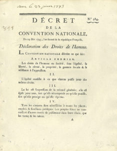 DROITS DE L’HOMME. Imprimé : Décret de la Convention nationale… Déclaration des Droits de l’homme, 29 mai 1793 (Paris, Imprimerie nationale exécutive du Louvre, 1793) ; in-4 de 6 p. (en feuilles, débroché).{CR}Seconde déclaration,...