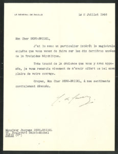Charles de GAULLE (1890-1970). L.S., Paris 2 juillet 1948, à Jacques Debû-Bridel ; 1 page in-4 à son en -tête Le Général de Gaulle (deuil).{CR}Il le félicite pour L’Agonie de la Troisième République, « la magistrale enquête que vous...