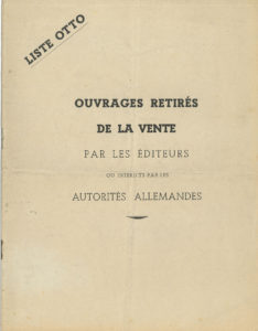 Pétain chef de l’État, Secrétariat général.{CR}Imprimés : – Liste Otto. Ouvrages retirés de la vente par les éditeurs ou interdit par les autorités allemandes (Paris, sept. 1940). – Les Lettres Françaises. N° spécial du 1er août 1944, Sur les ruines de la morale : Oradour-sur-Glanne. – Procès du maréchal Pétain devant la Haute Cour de justice (Impr. des journaux officiels, 1945), ensemble complet des 20 fascicules des 20 audience (23 juillet-14 août 1945).