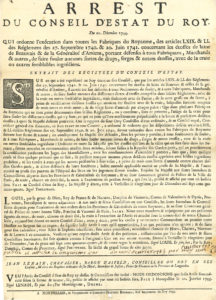 des troupes et l’approvisionnement des casernes, le commerce des blés, les foires et marchés à Mende, la dégradation des chemins, l’interdiction des jeux de hasard à Montpellier ; jugements concernant les nouveaux-convertis ; ordonnances et édits royaux et arrêts du Conseil d’État concernant le Languedoc, les faux-monnayeurs, les députés de la province, le commerce des étoffes, les droits de marque sur les cartes et cuivres, les déserteurs, les congés d’ancienneté, les pensions, la création d’actions sur les fermes générales, etc.{CR}Imprimés : factums et mémoires de procédure concernant notamment la famille Michel du Roc, les habitants de Saint-Sever, le marquis de Gouvernet, la ville de Marvejols, le diocèse de Mende, l’évêché de Périgueux, la famille d’Apcher… ; édits, ordonnances et règlements concernant les tailles, la police dans les villes de Montpellier et d’Uzès, l’assemblée des États, etc. Abrégé de la généalogie de la maison de Chasteauneuf de Randon ; Trois Traitez de la philosophie naturelle… (1612)