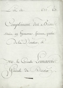 des Grenadiers à pied (demi-page in-fol. à en-tête Le Ministre de la Guerre, vignette). – Bulletin d’enregistrement du Conseil du sceau des Titres, signé par Dudon, 23 avril 1808 (1 p. et demie in-4 en partie impr.). – 2 lettres circulaires du Procureur général et du Secrétaire général du Conseil du sceau des Titres, confirmant le brevet d’investiture de la rente de 1 000 francs sur le Monte Napoleone, Paris 26 mars et 15 juillet 1810 (2 p. et demie in-fol. en partie impr., une vignette). – « Complément des biens situés en Hanovre, faisant partie de la dotation de M. le Comte Lemarois, Général de Division », 13 décembre 1810 (cahier de 12 pages sur vélin in-fol. sous chemise papier). – Copie conforme de la lettre adressée par le Ministère de la Guerre à Lemarois lui redonnant le montant de sa pension dont il a égaré le titre, Paris 10 février 1814 (1 p. in-fol.). – Instruction de la Grande Chancellerie de la Légion d’honneur pour recevoir son traitement chaque trimestre (impr., 2 p. in-fol.). – Lettre de la Grande Chancellerie de la Légion d’honneur, reçu de sa lettre et de son brevet d’officier de l’ordre royal, 24 juillet 1816 (1 p. in-4 en partie impr., adresse). {CR}On joint 3 photographies reproduisant les propriétés de la famille Lemarois : le château de Pépinvast dans la Manche et l’hôtel particulier, maintenant avenue Franklin-Roosevelt, construit par le fils du général en 1863.