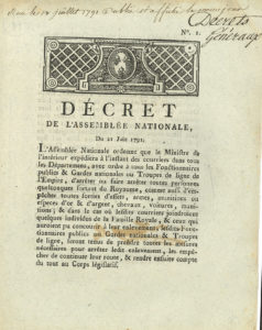 [LOUIS XVI (1754-1793)]. 24 imprimés et un manuscrit, 1791-1793 ; in-4, quelques bandeaux-vignettes.{CR}Décrets et lois concernant la limitation des pouvoirs du Roi, les émigrés, la fuite du Roi et de la famille royale, son arrestation, la...