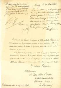 1 page in-fol.{CR}Ouvrard, en prison pour dettes, envoie à S.A.R. le Duc d’Orléans « un exemplaire de la première partie de mes mémoires, Elle m’y verra tout entier ; à toutes les époques, ma vie n’a été qu’une lutte avec le pouvoir »…{CR}Louis-Philippe a noté en haut de la page : « Il faut me faire une réponse de remerciment, & lui dire que je les lirai avec beaucoup d’intérêt. J’ai gardé le livre ». À côté de cette apostille, minute du projet de réponse daté du 29 mai.
