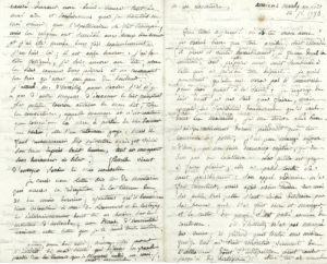 sevrage.{CR}Le temps est affreux… « Je regorge de lait dont je ne sais que faire, mais excepté la sensibilité douloureuse qu’il cause dans les mamelles, je me trouve assés bien ». Elle évoque ensuite leur fille [Eudora, âgée de quinze mois] : « La petite est gaye à faire plaisir ; elle a passé toute sa nuit paisiblement : son appel ordinaire m’a fait tressaillir, mais après avoir tendu vers moi ses petits bras, elle s’est laissée distraire par sa bonne qui l’a fait boire et manger, et le reste du jour s’est passé comme de coutume ». Elle a eu la visite du médecin qui prétend que ses misères « viennent de l’esthomac dont l’indisposition peut causer jusqu’à des vertiges. [..] Bientôt il faudra savoir comment les gens se portent pour juger s’ils ont le sens commun. Cette doctrine paroit plaisante ; quoiqu’au fond je la crois très bien appuyée, je serois tentée de la berner : elle prête admirablement à la palinodie ». Elle donne et demande des nouvelles des uns et des autres, et dit son amour en italien « giammai non potro dirti quanto t’amo et sogno a te ». Elle reprend la plume le mercredi : ses troubles digestifs s’aggravent : « il est onze heures, j’ai la tête fatiguée, je suis encore au lit, avec les seins comme deux pierres et ne remuant les bras qu’avec un peu de douleur. J’attends M. d’Hervilly pour savoir s’il n’y a pas d’autres moyens d’évacuer le lait promptement. La petite tourne autour de mon lit, tire les couvertures, appelle maman et n’est contente que lorsqu’on l’a mise à portée de me donner un baiser, elle s’en retourne gaye. Mais il faut recommencer dix minutes après ; et voilà son train depuis huit heures, tout en mangeant sans demander à téter »…