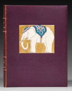 BARRUCAND (Victor). Le Chariot de terre cuite, d'après la pièce du théâtre indien attribuée au roi Soudraka. Paris, Piazza, 1921. In-4, maroquin violet, sur le premier plat grand éléphant blanc caparaçonné mosaïqué se détachant sur un fond de peau dorée, encadrement intérieur orné d'un jeu de filets dorés, doublure et gardes de moire violette, tranches dorées, couverture et dos, étui (Lehaye). 20 compositions en couleurs à pleine page de Léon Carré. Texte en deux tons sur fond teinté, agrémenté de motifs typographiques et d'encadrements en couleurs d'après des peintures décoratives d'art bouddhique. Un des 135 exemplaires sur japon impérial comprenant une suite en noir sur japon mince. Mors frottés et en partie fendus.