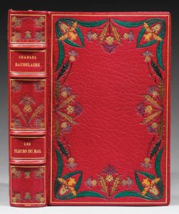 BAUDELAIRE (Charles). Les Fleurs du mal. Paris, Librairie des amateurs, Ferroud, 1910. In-8, maroquin grenat, filet doré et large dentelle de motifs végétaux (chardons et orchidées) mosaïqués dans divers tons, dos orné des mêmes motifs dans les caissons, encadrement intérieur orné de filets dorés avec reprise de certains motifs mosaïqués, doublure et gardes de soie marbrée, tête dorée sur témoins, couverture et dos, étui (Reliure de l'époque). 27 compositions de Georges Rochegrosse gravées à l'eau-forte par Eugène Decisy. Un des 80 exemplaires de tête sur japon impérial contenant 3 états des eaux-fortes, dont l'eau-forte pure. Reliure mosaïquée de qualité, non signée, dans le goût de Blanchetière. Prospectus ajouté. Petits frottements au dos.