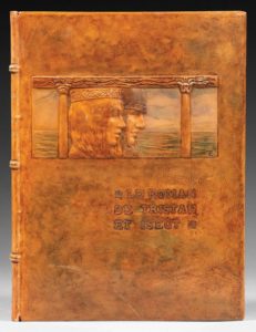 BÉDIER (Joseph). Le Roman de Tristan et Iseut, reconstitué d'après les poèmes français du XIIe siècle et illustré par Robert Engels. Paris, H. Piazza & Cie, 1900. In-4, veau teinté, composition en cuir modelé sur le premier plat, dos à nerfs titré, encadrement intérieur orné de cinq filets dorés, tranches dorées sur témoins, couverture et dos (Stroobants - Lepreux). Illustration en couleurs par Robert Engels. Tirage à 300 exemplaires numérotés, celui-ci un des 25 sur japon comprenant une suite sur chine. Charmante reliure ornée d'une composition modelée reprenant la couverture de Robert Engels. La composition est signée des initiales indéterminées CLM et datée 1903. Légers frottement sur le second plat.