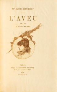 BERNHARDT (Sarah). L'Aveu, drame en un acte en prose. Paris, Paul Ollendorff, 1888. In-8, maroquin bordeaux à long grain, janséniste, bordure dorée intérieure, doublure et gardes de soie brochée, tête dorée, non rogné, couverture, étui (Trinckvel). Édition originale, illustrée de 4 dessins hors texte de Georges Clairin (peintre du célèbre portrait conservé au Petit Palais à Paris), et un portrait sur le titre, repris sur la couverture de parchemin. Un des 100 exemplaires sur japon, dans lequel on a ajouté une lettre autographe de l'actrice. Ex-libris de Sarah Bernhardt.