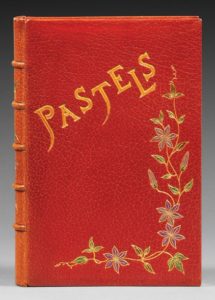 BOURGET (Paul) Pastels, Dix portraits de femmes. Paris, L. Conquet, 1895. In-8, maroquin brique, sur le premier plat le titre mosaïqué accompagné d'une branche de clématites violettes se répandant sur deux côtés, rappel au dos, encadrement intérieur orné d'une branche de muguet aux angles, doublure et gardes de moire grise, tranches dorées sur témoins, couverture et dos, étui (P. Ruban 1899). Joli livre, illustré de 11 aquarelles d'Alcide Robaudi sur le faux-titre général et les faux-titres des chapitres, et de 35 aquarelles d'Adolphe Giraldon dont une sur la couverture. Tirage à 200 exemplaires sur japon. Ex-libris de la bibliothèque du château des Rozais, 1908. Dos passé.