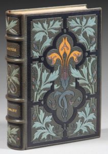 COPPÉE (François). Le Passant. Comédie en un acte et en vers. Paris, Armand Magnier, 1897. In-8, maroquin gris, sur les plats compartiments formés par un large listel imitant un vitrail, le compartiment central occupé par une fleur de lis ocre, les autres par deux branches de feuillage gris, dos orné du même feuillage, doublure de maroquin caramel encadré de listels gris foncé, gardes de moire grise, tranches dorées sur témoins, chemise demi-maroquin, étui, couverture (Marius Michel). 47 compositions de Louis-Édouard Fournier, gravées à l'eau-forte par Léon Boisson. Le manuscrit de François Coppée et la page de musique de Massenet ont été héliogravés par Arents. Tirage à 300 exemplaires, celui-ci sur vélin ne répondant à aucune des descriptions ; il comporte un état de plus que les 15 exemplaires de tête sur japon : quatre états dont un bistre, un avec remarques, un eau-forte pure avec remarques, la gravure finale en huit états. Magnifique reliure de Marius Michel, mosaïquée et doublée, nous introduisant dans l'univers moyenâgeux de la pièce. De la bibliothèque Jean Borderel, avec son ex-libris frappé sur la doublure. (I, 1938, n°52).