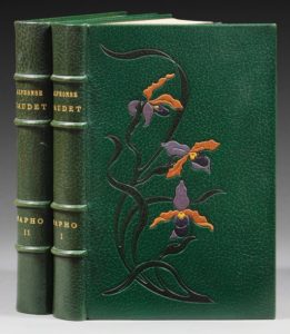 DAUDET (Alphonse). Sapho. Paris, Armand Magnier, 1897. 2 volumes grand in-8, maroquin vert, premier plat orné d'une grande tige fleurie de trois orchidées au naturel mosaïquées de fauve, de vert foncé, de mauve, de violet et de jaune, dos à quatre nerfs portant le nom de l'auteur et le titre dorés, encadrement intérieur de huit filets dorés, doublure et gardes de soie brochée, tranches dorées, couverture, étuis (Marius Michel). Compositions d'Auguste-François Gorguet gravées à l'eau-forte par Louis Muller. Tirage à 300 exemplaires, celui-ci un des 50 sur vélin de cuve contenant une double suite avec remarques des illustrations. De la Collection des dix. Charmante reliure de Marius Michel. Spécimen joint.