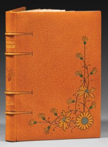 FRANCE (Anatole). Clio. Paris, Calmann Lévy, 1900. In-8, maroquin fauve, motif floral de grandes marguerites jaunes mosaïquées dans l'angle inférieur droit du premier plat se prolongeant sur les côtés, dos orné d'un bourgeon, bordure de fers chantournés dorés, doublure et gardes de soie brochée beige à motifs verts et roses, tranches dorées sur témoins, couverture et dos, étui (Ch. Meunier). Édition originale, ornée de 12 illustrations en couleurs de Mucha. Tirage à 170 exemplaires, celui-ci un des 50 sur papier de chine comportant 2 suites sur chine, l'une en couleurs, l'autre en noir.