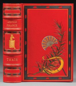 FRANCE (Anatole). Thaïs. Paris, A. Romagnol, 1900. In-8, maroquin orange, bordure composée d'un listel noir percé de loin en loin, au centre grand décor mosaïqué de diverses couleurs mêlant palmes, harpe antique et flabellum, dos orné de même avec au centre un trophée d'armes doré, bordure intérieure délimitée par deux filets gras dorés, fleuron mosaïqué aux angles, doublure et gardes de soie de couleurs, couverture et dos (Ch. Meunier, 1901). 65 compositions de Paul-Albert Laurens, dont 7 hors-texte, gravées à l'eau-forte et au burin par Léon Boisson. Tirage à 300 exemplaires, celui-ci un des 45 sur vélin d'Arches contenant deux suites des illustrations du texte et trois des hors-texte dont un sur chine, prospectus joint.