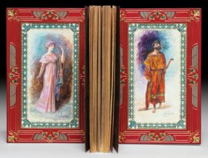 FRANCE (Anatole). Thaïs. Paris, F. Ferroud, 1909. In-8, maroquin rouge, listel de maroquin noir en encadrement, décor le long du dos de fleurs de lotus mosaïquées, dos orné de même, large encadrement mosaïqué orné des mêmes fleurs avec au centre de chaque doublure une peinture originale sur parchemin de Rochegrosse, tranches dorées sur témoins, couverture et dos, chemise demi-maroquin, étui (Levitzky). 15 compositions dont un frontispice en couleurs par Georges Rochegrosse, gravées à l'eau-forte par Eugène Decisy. Un des 85 exemplaires sur japon impérial contenant deux états des eaux-fortes dont l'avant-lettre avec remarques. Prospectus ajouté. Élégante reliure de Levitzky, comportant sur chaque doublure une peinture originale de Rochegrosse signée.