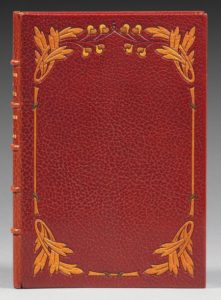 GUÉRIN (Maurice de). Poèmes en prose. Le Centaure. La Bacchante. Paris, Édouard Pelletan, 1901. In-8, maroquin brun, encadrement d'une tige florale avec feuillage aux angles et fruits sur le long du côté supérieur, encadrement intérieur orné d'un filet doré et d'une fleur mosaïquée aux angles, doublure et gardes de moire verte, tranches dorées sur témoins, couverture et dos, étui (Marius Michel). 7 compositions et décorations de Bellery-Desfontaines, gravées sur bois en six couleurs par Ernest Florian. Tirage à 365 exemplaires, celui-ci un des 130 exemplaires in-8 sur vélin de cuve, prospectus joint.
