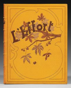 HARAUCOURT (Edmond). L'Effort. La Madone. L'Antéchrist. L'Immortalité. La Fin du monde. Paris, Les Bibliophiles contemporains, 1894. In-4, maroquin moutarde, sur le premier plat le titre réparti sur une branche de marronnier avec feuilles et fruits dans un encadrement dessiné par des filets à froid, dos orné du titre mosaïqué, guirlande intérieure de feuilles sur trois côtés, tranches dorées, couverture et dos, étui (P. Ruban, 1907). Cet ouvrage, parfaite production de l'Art nouveau, est illustré à chaque page d'une composition en couleurs organisée autour du texte. Les contes, au nombre de quatre, sont illustrés chacun par un artiste différent qui a utilisé une technique particulière : 18 lithographies originales en couleurs d'Alexandre Lunois pour La Madone, 38 compositions d'Eugène Courboin gravées au trait puis aquarellées pour L'Antéchrist, 33 compositions de Carloz Schwabe pour L'Immortalité dont 10 en noir gravées par Auguste Massé et 23 grands encadrements floraux aquarellés, et 46 dessins symbolistes d'Alexandre Séon pour La Fin du monde. La magnifique couverture illustrée sur les deux plats est signée de Léon Rudnicki. Tirage à 180 exemplaires sur vélin, celui-ci hors numérotation. Jolie reliure de Pétrus Ruban. Dos légèrement foncé.