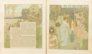 HOMÈRE. Nausikaa. Traduction de Leconte de Lisle. Paris, Piazza, 1899. In-4, demi-maroquin prune avec coins, filet, dos orné, tête dorée, couverture et dos, étui (Creuzevault). Seul livre illustré par Gaston de Latenay, orné de 50 spectaculaires compositions décoratives organisées en diptyque, de fleurons et culs-de-lampe, le tout gravé sur bois en couleurs par Ruckert. Le texte, placé dans des cartouches de format divers, inclus en réserve dans les compositions, débute par des initiales à fond décoratif varié. Tirage à 400 exemplaires, celui-ci sur papier vélin des Vosges. Une pointe angulaire du dernier feuillet manquante sur 1 cm. Mors du premier plat restauré sur toute la longueur.