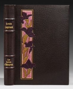 LEGRAND (Louis). Le Livre d'Heures. Paris, Gustave Pellet, 1898. In-8, maroquin noir, le long du dos bande verticale de maroquin lilas portant une branche de glaïeuls à fleurs violettes mosaïquées, doublure de maroquin violet serti d'un filet doré, gardes de moire violette, tranches dorées sur témoins, couverture et dos, étui (Noulhac). 13 eaux-fortes originales et 200 dessins gravés sur bois dans le texte de Louis Legrand. Tirage à 160 exemplaires sur vélin, celui-ci comporte deux états des eaux-fortes, en couleurs et en noir (pour la première : l'épreuve en noir est imprimée sur la couverture).