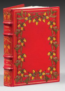 LOUŸS (Pierre). La Femme et le pantin. Paris, H. Piazza, 1903. In-8, maroquin rouge, encadrement d'une guirlande mosaïquée de citronnier, dos orné de même, encadrement intérieur orné d'une guirlande mosaïquée entre deux listels de maroquin fauve, doublure et gardes de soie brochée rose, tranches dorées sur témoins, couverture et dos, étui (Blanchetière-Bretault). 50 compositions en couleurs, dont 16 hors-texte, de Pierre Roig, et encadrements de texte décoratifs en couleurs et en noir de Georges Riom. Tirage à 300 exemplaires, celui-ci un des 260 sur papier vélin à la cuve. Charmante reliure mosaïquée, inspirée des bordures décoratives de Riom. Ex-libris de la bibliothèque du château des Rozais, 1908. Frottement à un nerf.