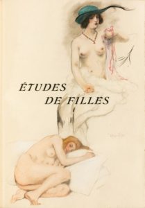 MAUCLAIR (Camille). Études de filles. Paris, Louis Michaud, 1910. In-4, maroquin aubergine, six filets dorés, dos orné de filets dorés dans les caissons, encadrement intérieur de filets dorés, tranches dorées, couverture et dos, étui (H. Blanchetière). 40 eaux-fortes originales et une couverture, le tout gravé par Lobel-Riche. Tirage à 250 exemplaires, celui-ci sur vélin d'Arches contenant 2 états des planches dont un avec remarques signé par l'artiste. Exemplaire enrichi de 3 dessins originaux : un dessin original au crayon de Lobel-Riche, un dessin aquarellé signé Rassenfosse sur le faux-titre, et un dessin original au crayon signé d'Édouard Chimot. Il contient en outre une lettre signée de Lobel-Riche datée 1933 (destinataire inconnu), 4 gravures de l'artiste et le prospectus de l'édition.