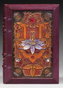 MAUCLAIR (Camille). Le Sang parle, poèmes. Paris, Maison du Livre, 1904. In-8, maroquin bordeaux, un grand cuir incisé et colorié serti dans chaque plat à bords biseautés, encadrement intérieur orné de filets et fleurons, tranches dorées sur témoins, couverture et dos, chemise demi-maroquin, étui (Ch. Meunier 1907). Édition originale. Exemplaire unique sur papier rose, imprimé pour Mademoiselle Jeanne Meunier, fille du relieur. Parfaite reliure de Charles Meunier, ornée de deux grands cuirs incisés, le premier portant une lyre et une grande passiflore violette, un cœur, des chardons et des épines, motifs que l'on retrouve au centre du second. Prospectus ajouté, billet autographe de l'auteur joint.