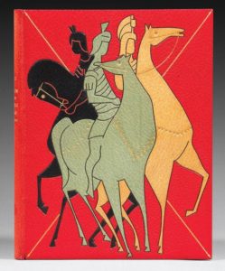 MONTESQUIEU. Considérations sur les causes de la grandeur des Romains et de leur décadence. S.l. [Brie-Comte-Robert], Les Bibliolâtres de France, 1957. In-4, maroquin rouge, grande composition mosaïquée figurant trois cavaliers romains sur le premier plat, dos lisse titré or, tête dorée, étui (L. R. Houades). 58 lithographies originales de Jean Delpech. Tirage à 700 exemplaires sur pur chiffon BFK de Rives. Reliure décorée de Léone-Raymonde Houades, relieuse parisienne.