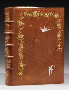 MOREAU (Hégésippe). Le Myosotis. Petits contes et petits vers. Nouvelle édition. Paris, Librairie L. Conquet, 1893. Grand in-8, maroquin lavallière, plats et dos ornés de branchages fleuris dorés et mosaïqués dans divers tons de vert, lesquels sont accompagnés ici et là de petits papillons et de deux oiseaux dorés et argentés, encadrement intérieur de branchages dorés et mosaïqués aux angles, doublure et gardes de moire marron, doubles gardes de papier marbré, tranches dorées sur témoins, couverture et dos (Ch. Meunier). 134 compositions d'Alcide Robaudi gravées sur bois par Clément Bellenger. Tirage à 500 exemplaires. Un des 150 premiers exemplaires, celui-ci sur chine, comprenant une suite de presque toutes les illustrations et une autre version supplémentaire du frontispice. Charmante reliure de Charles Meunier. Quelques piqûres.