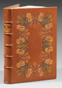 MORIN (Louis). Les Dimanches parisiens. Notes d'un décadent. Paris, L. Conquet, 1898. In-8, maroquin brun, sur le premier plat large encadrement mosaïqué de feuilles et fruits de marronnier de diverses couleurs, reprise du décor au centre du second plat, encadrement intérieur orné de filets joignant des petites feuilles dorées, doublure et gardes de faille verte, tranches dorées sur témoins, couverture et dos, chemise demi-maroquin, étui (Canape R.D.). 41 eaux-fortes originales d'Auguste Lepère. C'est le dernier livre publié par Léon Conquet, il fut achevé après son décès par Léopold Carteret. Tirage à 250 exemplaires sur vélin du Marais, celui-ci enrichi d'une suite de toutes les gravures. Harmonieuse reliure dans les tons d'automne.