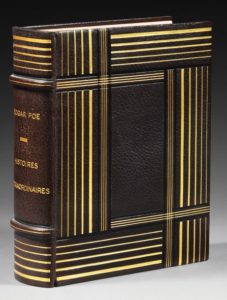POE (Edgar Allan). Histoires extraordinaires. Traduction et préface de Charles Baudelaire. Paris, Imprimé par Charles Meunier pour les membres de l'Association et du Cercle Grolier, 1934. Fort volume in-4, maroquin noir, jeux de filets gras et maigres s'entrecroisant ou discontinus sur les plats et le dos, dos à deux gros nerfs portant le titre et le nom de l'auteur en capitales dorées, large filet doré intérieur, doublure et gardes de moire rose, tranches dorées sur témoin, étui (Gruel). Édition faite et imprimée par Charles Meunier pour le compte des 125 membres bibliophiles de l'Association et du Cercle Grolier. 50 eaux-fortes originales hors-texte de Charles Fouqueray. Exemplaire comprenant une très belle suite des gravures, avec remarques, tirées sur satin. Imposante reliure décorée de Gruel.