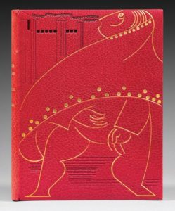 RABELAIS (François). Pantagruel. S.l. [Brie-Comte-Robert], Les Bibliolâtres de France, 1960. In-4, maroquin grenat, composition dessinée au filet doré et noir couvrant le premier plat, dos lisse titré or, doublure et gardes de moire rouge, tête dorée, témoins, couverture et dos, étui (L. R. Houades). 109 bois originaux de Charles-Émile Pinson. Tirage à 700 exemplaires. Reliure décorée de Léone-Raymonde Houades, relieuse parisienne : la composition au premier plat reprend un motif de l'illustration. Dos légèrement passé.