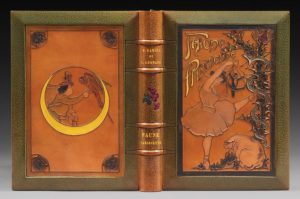 RAMIRO (Érasthène) et Louis LEGRAND. Faune parisienne. Paris, Gustave Pellet, 1901. In-8, maroquin vert olive, encastré dans chaque plat à bords biseautés un grand cuir incisé et peint, le premier portant le titre, fleur mosaïquée au dos, encadrement intérieur orné d'un filet doré et d'un pantin doré dans chaque angle, doublure et gardes de moire rose, tranches dorées sur témoins, couverture et dos, chemise demi-maroquin, étui (Ch. Meunier 1901). 20 eaux-fortes originales de Louis Legrand, dont 16 en couleurs y compris celle de la couverture, au repérage et à la poupée, 4 en noir, et environ 50 dessins dans le texte gravés sur bois par G. Lemoine. Tirage à 130 exemplaires sur papier vélin, celui-ci enrichi d'une suite des eaux-fortes en noir. Reliure de Charles Meunier, ornée de deux cuirs incisés et peints, l'un portant le titre, au milieu une danseuse manipulant un pantin, des tiges de chardons sur lesquelles s'enroulent un serpent, à ses pieds un cochon rose, sur le second plat une femme parlant avec un perroquet, évocation de l'eau-forte Bavardage. Dos passé.