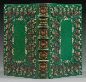 SAND (George). François le Champi. Paris, L. Carteret, 1905. In-8, maroquin vert, très large encadrement d'une frise de branches feuillues, chacune dans un cercle dessiné par un listel de maroquin noir, le tout parsemé de fleurs multicolores, dos orné de même, encadrement intérieur orné de jeux de filets dorés, doublure et gardes de reps vert, tranches dorées sur témoins, couverture et dos, étui (Canape R. D.). 31 compositions par Alcide Robaudi, gravées au burin et à l'eau-forte par Henri Manesse. Tirage à 400 exemplaires. Un des 30 exemplaires de grand choix sur japon et vélin du Marais, celui-ci sur vélin du Marais avec les gravures en trois états dont l'eau-forte pure et l'avant-lettre. Reliure de Georges Canape orné d'un foisonnant décor floral mosaïqué.