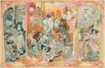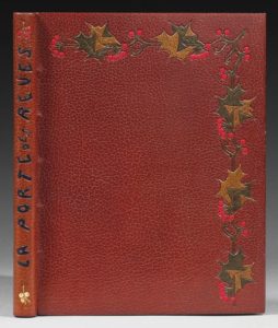 SCHWOB (Marcel). La Porte des rêves. Paris, Les Bibliophiles-indépendants, 1899. In-4, maroquin prune, le premier plat décoré d'une guirlande de houx mosaïquée se prolongeant sur deux côtés, sur le second plat la même composition avec une branche de gui mosaïquée, titre mosaïqué au dos, tranches dorées sur témoins, couverture et dos, étui (A. Cuzin). Édition exécutée sous la direction artistique d'Octave Uzanne. Elle est ornée de 16 planches gravées sur bois en noir, de 32 encadrements variés, monochromes, une couleur différente pour chaque conte, de 15 culs-de-lampe, et d'un frontispice en triptyque gravé en taille douce et colorié à l'aquarelle à la main, le tout par Georges de Feure. Tirage à 220 exemplaires numérotés sur japon, dont 20 exemplaires d'auteur et collaborateurs. Reliure décorée d'Adolphe Cuzin, le fils du grand Francisque Cuzin. Après la faillite de son propre atelier qu'il dirigea de 1900 à 1902, Adolphe Cuzin devint à partir de 1920 professeur à l'École centrale des Arts Décoratifs, fréquentée par Rose Adler, Jeanne Langrand ou Geneviève de Léotard, dont il dorait les reliures.