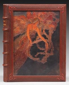 VORAGINE (Jacques de). La Légende dorée. Traduction française de H. Piazza. Paris, G. Boudet, 1896. In-4, maroquin brun, encastré dans le premier plat et bordé par un listel brun clair grand cuir incisé et peint, encadrement intérieur orné d'un double filet avec une feuille mosaïquée aux angles, doublure et gardes de soie brochée, tranches dorées sur témoins, couverture et dos, chemise demi-maroquin, étui (Mercier sr de Cuzin). 75 lithographies originales en couleurs et dessins gravés sur bois d'Alexandre Lunois. Tirage à 210 exemplaires, celui-ci un des 25 sur papier de chine, avec un double état en noir de toutes les illustrations. Reliure d'Émile Mercier, ornée d'un très beau cuir incisé signé d'Auguste Lepère représentant des anges tressant la couronne d'épines. Déchirure verticale au centre de la seconde garde.