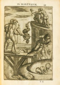 GALLONIO (Antonio). De sanctorum martyrum cruciatibus. Paris, Claude Cramoisy, 1660. In-4, veau brun, dos orné (Reliure de l'époque). Édifiant martyrologue illustré, orné d'un frontispice et de 44 planches gravées sur cuivre par Antonio Tempesta représentant le martyre des saints. Ces gravures représentent avec puissance des scènes d'atrocités et des supplices en tous genres. Les sujets sont légendés au moyen de lettres capitales qui renvoient à des textes explicatifs imprimés en regard des planches, la plupart placés dans de beaux encadrements à décor de cuir enroulé et de grotesques. Cette nouvelle édition latine est dédiée à Nicolas Fouquet et a été partagée entre Claude Cramoisy et Frédéric Léonard. L'originale a paru à Rome en 1594. Mouillure claire dans la marge inférieure de quelques feuillets, légères rousseurs. Reliure très restaurée (dos, charnières et coins), pièce de titre postérieure.