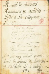 MANUSCRIT. - Recueil de chansons. Romances & ariettes. Dédié à la Citoyenne L... C... Fait par moy Antoine Vivier. Dans les prisons du Baingal à Calcutta le 6 octobre 1799. Manuscrit in-4 (200 x 150 mm) de 188 pages et 7 pages non chiffres, demi-veau granité, dos lisse, pièce de titre (Reliure moderne). Très intéressant manuscrit rédigé par un militaire français dans les prisons du Bengale et d'Angleterre entre 1799 et 1805, contenant des poèmes et des chansons à boire sur le thème de l'amour et de la politique. Le titre des pièces suivantes donnent une idée de la teneur du manuscrit : Complainte patriotique sur la mort du général Hoche, La petite souricière perdue de la belle Doris, Le mariage débauché ou le mary ivrogne & la femme coquette, Couplet bachique, Le peintre amoureux, etc. Les pièces politiques ont un rapport avec la République, Bonaparte, et l'Angleterre. Le manuscrit contient à la fin une pièce intitulée les Pontons de la Meedway, Vérité sur la situation des prisonniers français cousinez dans les prisons de la Grande-Bretagne, relation poignante du sort des prisonniers entassés dans les prisons flottantes anglaises de la rade de Chatham, sur la rivière Meedway dans le Kent. On y trouve à la suite une dernière description de la situation des prisonniers : J'arrive à Norman Cross le 11 juin 1801, lieu où sont détenus quatre mille français. Quel expectable [sic] a frappé mes yeux en voyant une infinité de malheureux, décharnés, affamés, couverts de lambeaux [...]. Manuscrit à l'encre brune. Les 126 premières pages sont encadrées d'un double filet à l'encre rose et bleue. Le manuscrit a vécu et présente de nombreuses taches d'encre, des mouillures et des rousseurs claires. Manque le feuillet correspondant aux pp. 18-19.