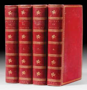 REGNARD (Jean-François). Les Œuvres. Nouvelle édition, revue, exactement corrigée, et conforme à la représentation. Paris, Maradan, 1790. 4 volumes grand in-8, maroquin rouge à long grain, roulette dorée, dos lisse orné, double roulette intérieure, tranches dorées (Reliure de l'époque). Jolie édition ornée d'un portrait et de 12 figures gravées en taille-douce, la plupart d'après Borel. Fine reliure en maroquin de l'époque. Légères rousseurs au cahier Ee du tome I et sur les planches. Petite mouillure en tête de plusieurs cahiers au tome II. Légers frottements à la reliure.