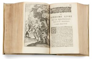 URFÉ (Honoré d'). L'Astrée. Ou par plusieurs histoires, et sous personnes de Bergers, & d'autres, sont deduits les divers effets de l'honneste Amitié. Paris, Antoine de Sommaville, 1632-1633. 5 volumes in-8, vélin à recouvrement, traces de liens (Reliure de l'époque). Édition partagée entre Augustin Courbet et Antoine de Sommaville, illustrée de 5 titres gravés, 10 portraits (2 répétés par tome) et 60 jolies figures gravées en taille-douce par ou d'après Daret, Daniel Rabel et Michel Lasne, le tout compris dans la pagination. Exemplaire en vélin de l'époque, complet des jolies figures et du texte du roman. Il manque seulement 3 feuillets liminaires comportant chacun un portrait (un au tome II, un autre au tome III et le dernier au tome V), ainsi que des feuillets non chiffrés signalés par Tchemerzine (V, p. 944) à la fin des tomes I, II, III et V (en tout 12 feuillets). Manque de papier dans la marge inférieure du feuillet C7 au tome I, restauration de papier à l'angle ou dans la marge de 4 ou 5 feuillets sans atteinte au texte. Des rousseurs. Une partie du dos au tome II restaurée.